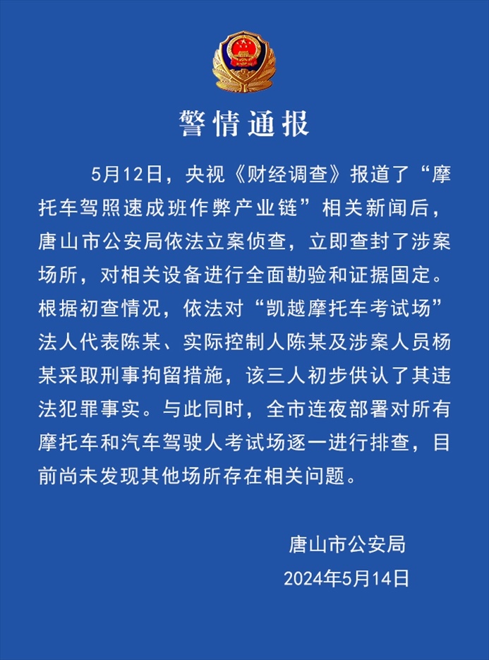 ·唐山警方通報“摩托車駕照速成班作弊產業(yè)鏈”:3人被刑拘。