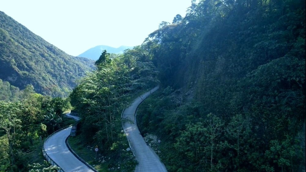 茶場(chǎng)道路順著山谷延伸,像一條絲帶纏繞在翠綠的山上,與國(guó)道559線扎墨段(即