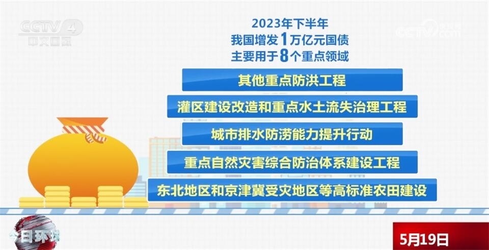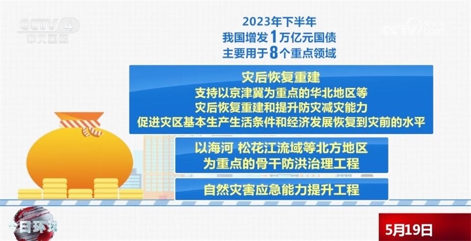 去年下半年,我國增發(fā)了1萬億元國債,主要用于8個重點領域,包括災后恢復重建,支持以京津冀為重點的華北地區(qū)等災后恢復重建和提升防災減災能力,促進災區(qū)基本生產(chǎn)生活條件和經(jīng)濟發(fā)展恢復到災前的水平,以海河、松花江流域等北方地區(qū)為重點的骨干防洪治理工程,自然災害應急能力提升工程,其他重點防洪工程,灌區(qū)建設改造和重點水土流失治理工程,城市排水防澇能力提升行動,重點自然災害綜合防治體系建設工程,東北地區(qū)和京津冀受災地區(qū)等高標準農田建設。