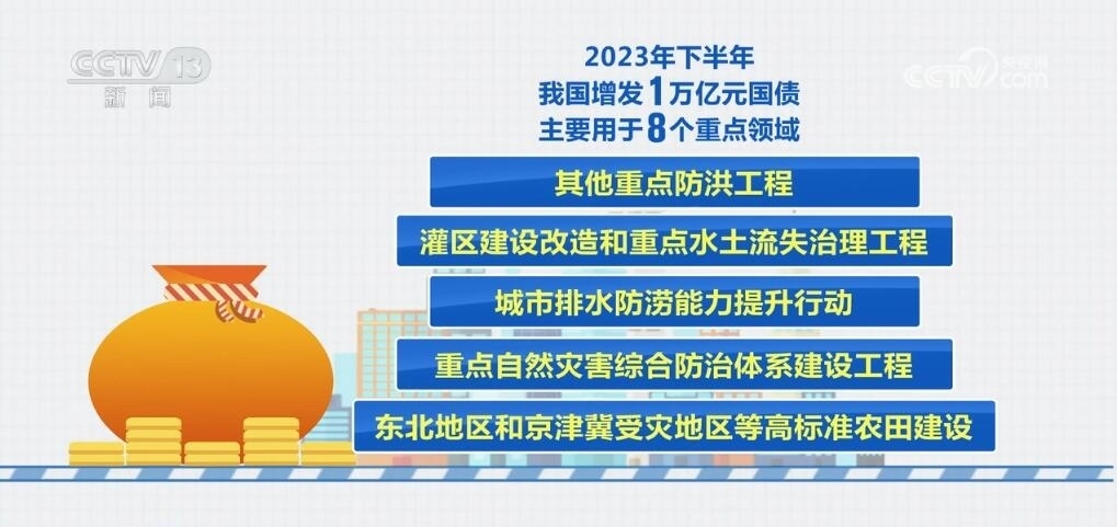 去年下半年,我國增發(fā)了1萬億元國債,主要用于8個重點領(lǐng)域,包括:災(zāi)后恢復(fù)重建,支持以京津冀為重點的華北地區(qū)等災(zāi)后恢復(fù)重建和提升防災(zāi)減災(zāi)能力,促進(jìn)災(zāi)區(qū)基本生產(chǎn)生活條件和經(jīng)濟發(fā)展恢復(fù)到災(zāi)前的水平;以海河、松花江流域等北方地區(qū)為重點的骨干防洪治理工程;自然災(zāi)害應(yīng)急能力提升工程;其他重點防洪工程;灌區(qū)建設(shè)改造和重點水土流失治理工程;城市排水防澇能力提升行動;重點自然災(zāi)害綜合防治體系建設(shè)工程;東北地區(qū)和京津冀受災(zāi)地區(qū)等高標(biāo)準(zhǔn)農(nóng)田建設(shè)。