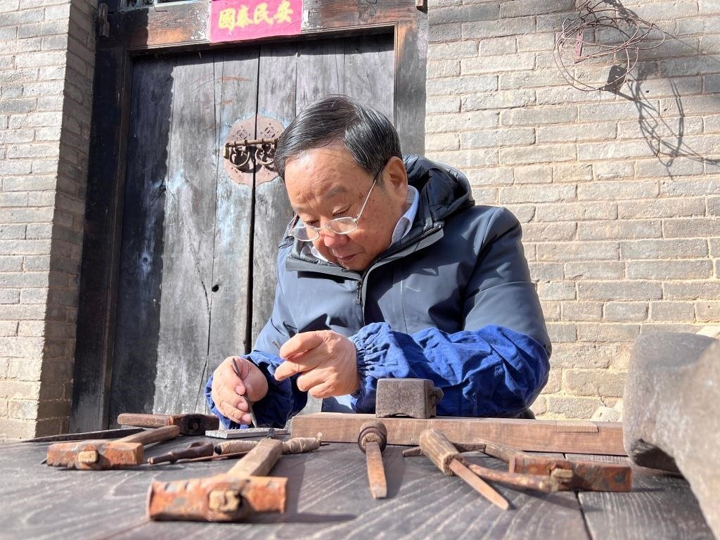 還沒進(jìn)門,院里就傳來(lái)“唿噠唿噠”的手拉風(fēng)箱聲,裴向南的老搭檔正忙著生火,一推一拉,火苗呼呼地竄起。一旁的裴師傅則不緊不慢地準(zhǔn)備著制針的工具。院落中央的老樹下,小木桌被熟練地支起,小錘、銼刀等一字排開、整齊碼放,足足有十幾件?!岸际亲?zhèn)鞯膶氊悾昧撕枚嗄??!?/p>