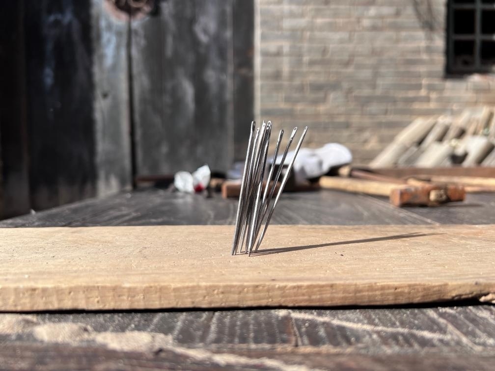傳承人裴向南的主業(yè)是鄉(xiāng)村醫(yī)生,如今利用節(jié)假日和業(yè)余時(shí)間為大陽(yáng)古鎮(zhèn)的游客展演古法制針,人們可以在這里感受非遺魅力、追尋歷史印記?!懊恳幻妒止や撫樁际仟?dú)一無(wú)二的?!彼f(shuō),大陽(yáng)的鋼針來(lái)之不易,一定要用心傳承好。話音未落,裴向南捏起一小撮鋼針,信手一甩,一排明晃晃的鋼針齊刷刷地扎在了木板上。