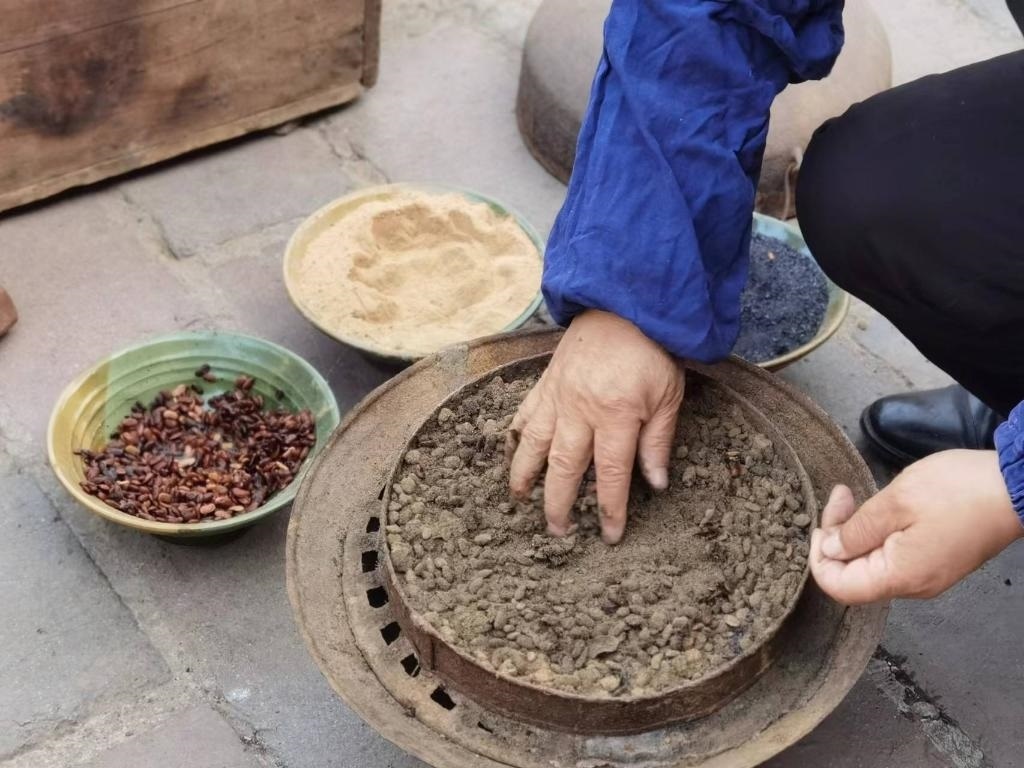 沖好針孔,便在磨石上反復(fù)銼尖。隨后倒入熱鍋里翻炒,再舀入一瓢水,針的剛性和硬度由此增加。接下來(lái)便輪到三大碗“大陽(yáng)秘方”登場(chǎng):白崖土粉末、松木炭和發(fā)酵后的豆豉,用于蒸針?!八赡咎靠梢栽黾愉撫樀暮剂?,提升硬度;豆豉增加亮度;白崖土粉末作為分散劑讓針受熱均勻。這樣處理后可以保證針質(zhì)更堅(jiān)硬又有光澤?!?/p>