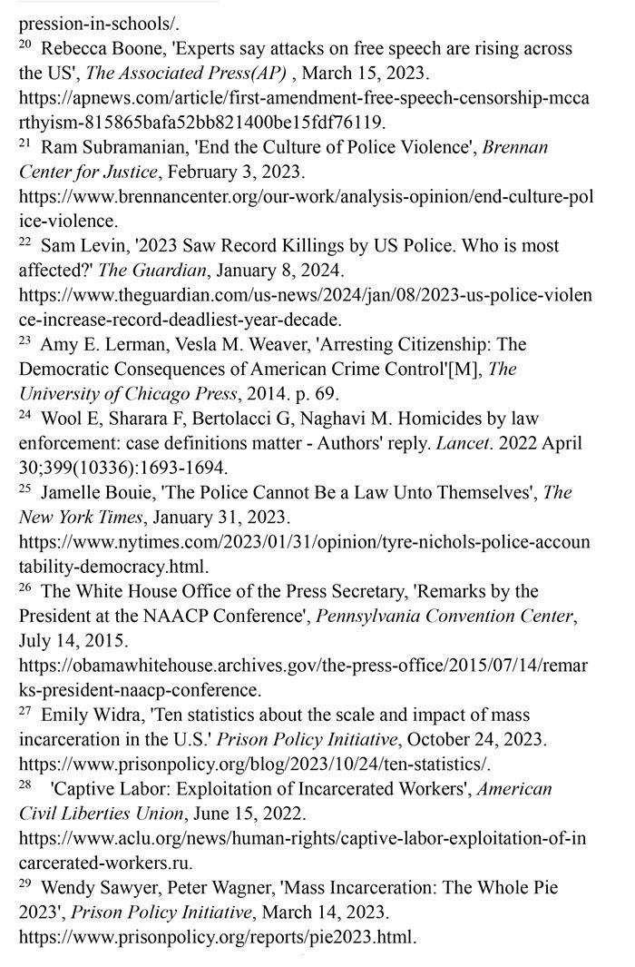 非洲裔在執(zhí)法領(lǐng)域面臨嚴(yán)重種族歧視。2023年1月3日,洛杉磯31歲的非洲裔男子基南·安德森涉嫌交通肇事,警方在制服他的過程中使用電擊槍擊中其6次,致其心臟病發(fā),送醫(yī)不治身亡。(注39)2023年1月7日,田納西州孟菲斯市的警察以“魯莽駕駛”為由將29歲的非洲裔男子泰爾·尼科爾斯攔下,并對其進行長達數(shù)分鐘的殘忍毆打。三天后尼科爾斯因傷勢過重去世,而事后的調(diào)查無法證實警察關(guān)于其“魯莽駕駛”的說法。(注40)這兩起非洲裔遭受警察暴力執(zhí)法身亡案例引發(fā)多名聯(lián)合國專家的高度關(guān)注。專家們強調(diào),在兩起事件中,警察使用的武力違反保護生命權(quán),禁止酷刑和其他殘忍、不人道或有辱人格待遇或處罰的國際準(zhǔn)則,也不符合聯(lián)合國《執(zhí)法人員行為守則》和《執(zhí)法人員使用武力和火器的基本原則》。(注41)聯(lián)合國人權(quán)理事會在執(zhí)法工作中推進種族正義和平等的國際獨立專家機制在對美國實地訪問后發(fā)布報告指出,針對非洲裔的系統(tǒng)性種族主義已經(jīng)滲透到美國警察隊伍和刑事司法系統(tǒng)。非洲裔被警察殺害的可能性是白人的3倍,被監(jiān)禁的可能性是白人的4.5倍。在每年1000多起警察殺人案件中,只有1%的涉事警察被指控。報告警告說,美國如果不按照國際標(biāo)準(zhǔn)改革警察使用武力的規(guī)則,許多殺戮將繼續(xù)發(fā)生。(注42)