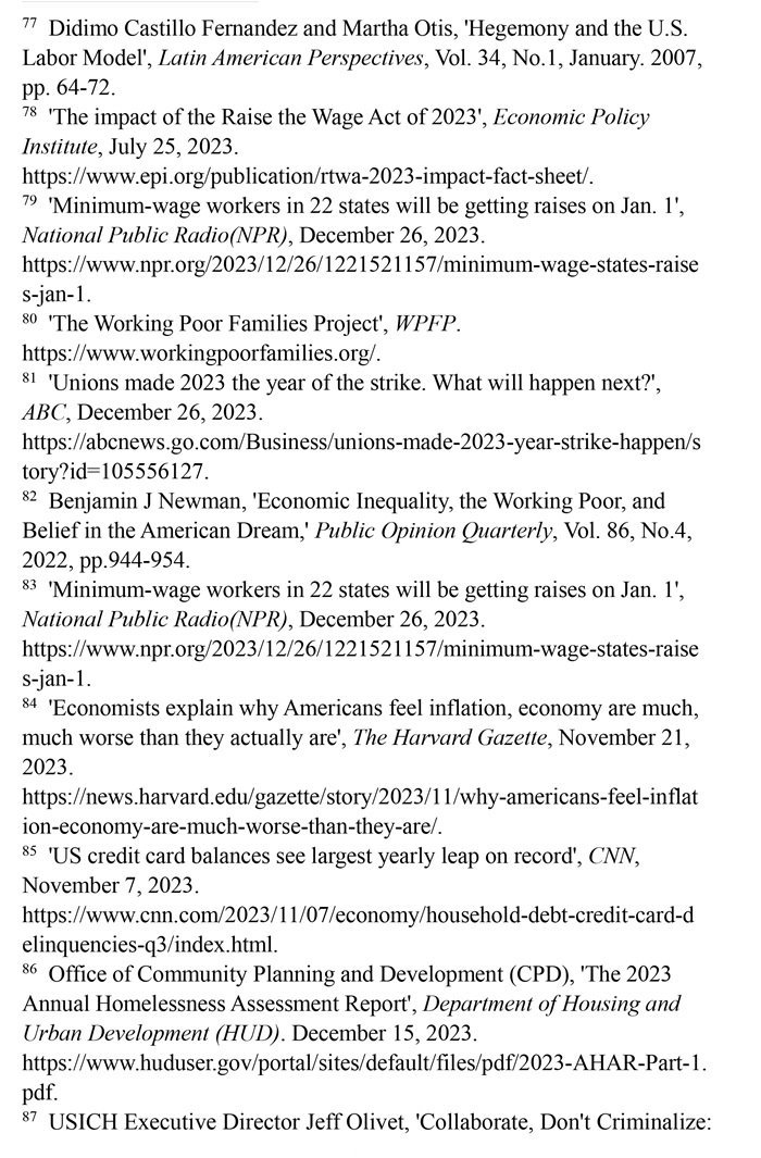 “工作者貧困”問題突出。美國勞動力市場狀況發(fā)生了結(jié)構(gòu)性變化,低薪崗位和缺乏監(jiān)管普遍存在。(注77)有大批“工作窮人”終日勞作,其工資水平卻難以維持基本生計,還缺乏應(yīng)有的社會保障。美國聯(lián)邦最低時薪標(biāo)準(zhǔn)自2009年以來一直沒有上調(diào)。(注78)美國勞工部的數(shù)據(jù)顯示,2023年仍有20個州維持聯(lián)邦最低時薪標(biāo)準(zhǔn)。(注79)美國有1150萬個低收入工薪家庭,包括1480萬兒童在內(nèi)的2990多萬美國人生活在這些低收入工薪家庭。(注80)勞資收入增長懸殊導(dǎo)致多行業(yè)大面積罷工。2023年,美國發(fā)生了21世紀(jì)以來波及范圍最廣的罷工潮,包括影視、制造、醫(yī)療、媒體在內(nèi)的多個行業(yè)都出現(xiàn)大規(guī)模罷工。(注81)加利福尼亞州大學(xué)公共政策與政治學(xué)院副教授本杰明·紐曼評論稱,陷入結(jié)構(gòu)性貧困之中的“工作窮人”既缺乏機會平等,也難以向上流動,他們極大地降低了對“美國夢”的信念。(注82)