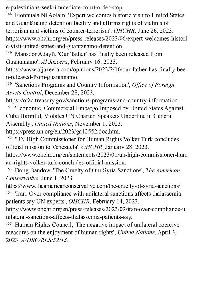 長期濫施單邊制裁造成嚴(yán)重人道主義后果。自1950年以來,美國使用的制裁次數(shù)居全球之首。根據(jù)美國財政部2023年12月28日公布的數(shù)據(jù),美國制裁的國家超過20個。(注150)第78屆聯(lián)合國大會發(fā)言人2023年11月1日指出,美國對古巴實施的經(jīng)濟、商業(yè)和金融封鎖違反了《聯(lián)合國憲章》,對古巴人民造成了毀滅性影響。(注151)聯(lián)合國大會2023年11月2日通過決議,再次敦促美國終止對古巴長達60多年的經(jīng)濟、商業(yè)和金融封鎖,這是聯(lián)合國大會連續(xù)第31年通過類似決議。2023年1月28日,聯(lián)合國人權(quán)事務(wù)高級專員沃爾克·圖爾克在訪問委內(nèi)瑞拉后表示,2017年以來美國施加的制裁加劇了委內(nèi)瑞拉的經(jīng)濟危機,嚴(yán)重阻礙人權(quán)的實現(xiàn)。(注152)“美國保守派”網(wǎng)站2023年6月1日報道,美國制裁進一步加劇了敘利亞人民的貧困。敘利亞70%的人口面臨食物短缺,其中1200萬人三餐不繼,290萬人食不果腹。(注153)聯(lián)合國人權(quán)理事會單邊強制措施對人權(quán)負(fù)面影響問題特別報告員阿萊娜·杜晗2023年2月14日指出,美國對伊朗的制裁減少了地中海貧血癥患者從國外進口救命藥物的機會,導(dǎo)致伊朗患者的并發(fā)癥和死亡率增加,是對健康權(quán)的侵犯。(注154)聯(lián)合國人權(quán)理事會2023年4月3日通過決議指出,單邊強制性措施會對目標(biāo)國家廣大民眾的人權(quán)產(chǎn)生深遠(yuǎn)影響,對窮人和處境最脆弱的人影響尤為嚴(yán)重。決議譴責(zé)某些大國繼續(xù)單方面適用單邊強制性措施。美國在該決議表決中投了反對票。(注155)