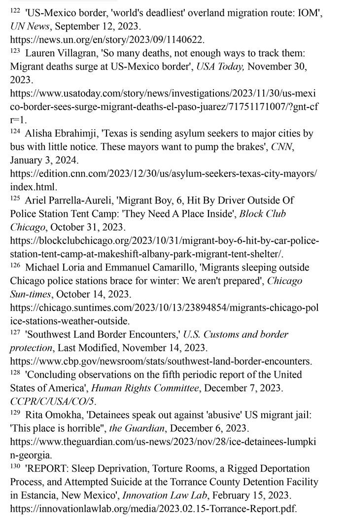 入境移民遭受酷刑及其他不人道待遇。2023財年,在美國南部邊境遭逮捕或驅(qū)逐的移民總數(shù)達240多萬人,再創(chuàng)歷史新高。(注127)聯(lián)合國人權(quán)事務(wù)委員會對移民在美國受到長時間的拘留表示擔(dān)憂,批評美國的拘留所條件惡劣,人滿為患,被拘押者無法獲得食物、水和醫(yī)療服務(wù),導(dǎo)致包括兒童在內(nèi)的許多人死亡;公共和私營移民拘留設(shè)施存在性暴力、長期單獨監(jiān)禁、虐待等侵犯人權(quán)問題。(注128)英國《衛(wèi)報》網(wǎng)站2023年12月6日報道,由美國私人監(jiān)獄公司CoreCivic運營的、位于佐治亞州蘭普金的斯圖爾特拘留中心存在長期單獨監(jiān)禁、性虐待、醫(yī)療疏忽以及強迫勞動等令人擔(dān)憂的問題。(注129)創(chuàng)新法律實驗室于2023年2月15日發(fā)布報告揭露,由CoreCivic運營的、位于新墨西哥州埃斯坦西亞的托蘭斯縣拘留所存在對被關(guān)押者實施酷刑現(xiàn)象。在夜間,每隔15分鐘就會有一名警衛(wèi)開著收音機的最大音量走過這些房間,大聲地敲著門,并用手電筒強光照進房間,吵醒任何可能睡著的人。在寒冷的天氣里,每個房間的通風(fēng)管道整夜都在吹冷空氣。一些人試圖用衛(wèi)生紙或毯子蓋住通風(fēng)口,但警衛(wèi)們拿走了用來阻擋冷空氣的任何東西。這些牢房里,廁所污水和糞便溢出,人們被迫睡在臭氣熏天的地板上。(注130)