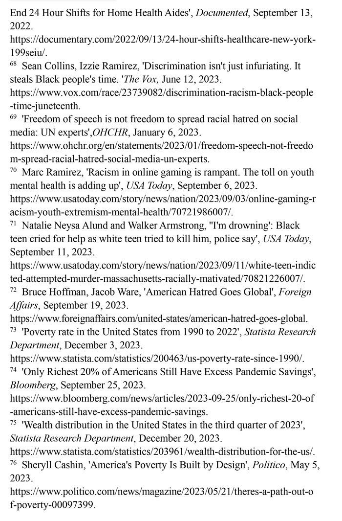 少數(shù)族裔遭遇職場歧視。美國一家名為“溫室”的招聘軟件公司發(fā)布的《2023年求職者面試經(jīng)歷報告》顯示,招聘過程中的歧視現(xiàn)象“相當(dāng)令人擔(dān)憂”。34%的求職者在面試中遇到過歧視性問題,近1/5的求職者曾試圖通過在簡歷中更改姓名,以避免受歧視性招聘行為的影響。在改名的求職者中,有45%是為了讓自己聽起來“不那么有族裔特點”。(注65)英國《衛(wèi)報》網(wǎng)站2023年4月23日披露,美國政府?dāng)?shù)十年來刻意逃避勞工保護責(zé)任,壓榨少數(shù)族裔勞工。紐約的有色族裔護工不僅被迫接受連續(xù)長時間的工作,薪資還受到克扣。不少護工因此罹患失眠、慢性病等疾病,對護工及其家庭造成嚴(yán)重傷害。(注66)少數(shù)族裔勞工一直嘗試通過各種渠道爭取權(quán)利保障,但在一些利益集團阻礙下成效寥寥。(注67)沃克斯新聞網(wǎng)2023年6月12日報道,在美國,非洲裔一直比白人掙得少。這種差異意味著在種族歧視的影響下,非洲裔時間價值明顯低于白人,為了彌補歧視造成的工資差距,非洲裔工人每天必須多工作2.7小時。(注68)
