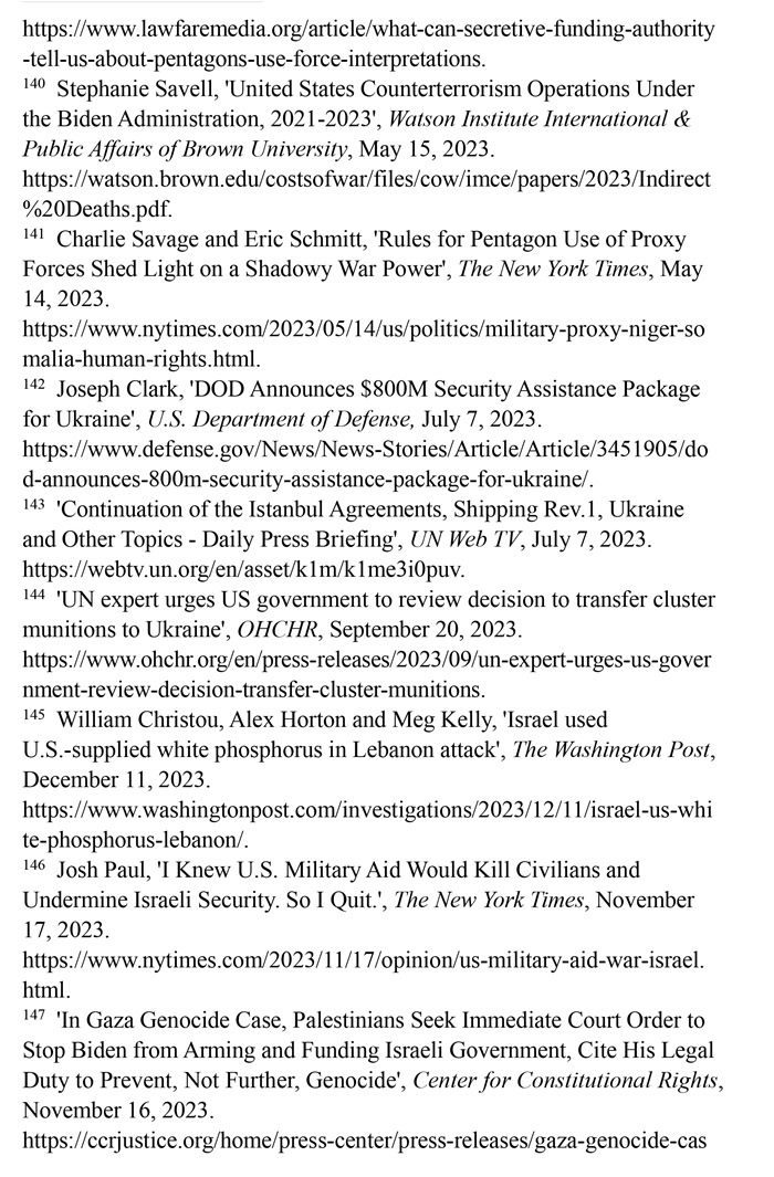 持續(xù)向沖突地區(qū)提供武器。美國國防部2023年7月7日發(fā)布的新聞稿顯示,美國向烏克蘭提供的價值8億美元的額外軍事援助中,包含大量集束彈藥。(注142)聯(lián)合國秘書長副發(fā)言人哈克2023年7月7日回答記者提問時表示,聯(lián)合國秘書長安東尼奧·古特雷斯希望各國遵守《集束彈藥公約》,不要在戰(zhàn)場上繼續(xù)使用集束彈藥。(注143)聯(lián)合國人權(quán)高專辦網(wǎng)站2023年9月20日報道,聯(lián)合國人權(quán)理事會酷刑和其他殘忍、不人道或有辱人格的待遇或處罰問題特別報告員愛麗絲·吉爾·愛德華茲2023年7月向美國政府發(fā)出緊急信函,警告集束彈藥會對平民造成嚴(yán)重傷害。(注144)《華盛頓郵報》網(wǎng)站2023年12月11日報道,美國每年流入以色列的軍火達數(shù)十億美元,以色列在10月對黎巴嫩南部的一次襲擊中使用了美國供應(yīng)的白磷彈藥,造成至少9名平民受傷。(注145)美國國務(wù)院政治軍事事務(wù)局前局長喬?!けA_2023年10月18日在《紐約時報》網(wǎng)站發(fā)表專欄文章指出,美國每年向以色列提供至少38億美元軍事援助,加沙地帶最嚴(yán)重的人員傷亡大多是由美國提供的彈藥所導(dǎo)致,譴責(zé)這種軍事援助無視人權(quán)問題。(注146)美國人權(quán)組織“憲法權(quán)利中心”2023年11月16日報道,滅絕種族與死刑問題專家威廉·沙巴斯指責(zé)美國未能履行防止種族滅絕的法律義務(wù),違反了習(xí)慣國際法和《防止及懲治滅絕種族罪公約》。(注147)