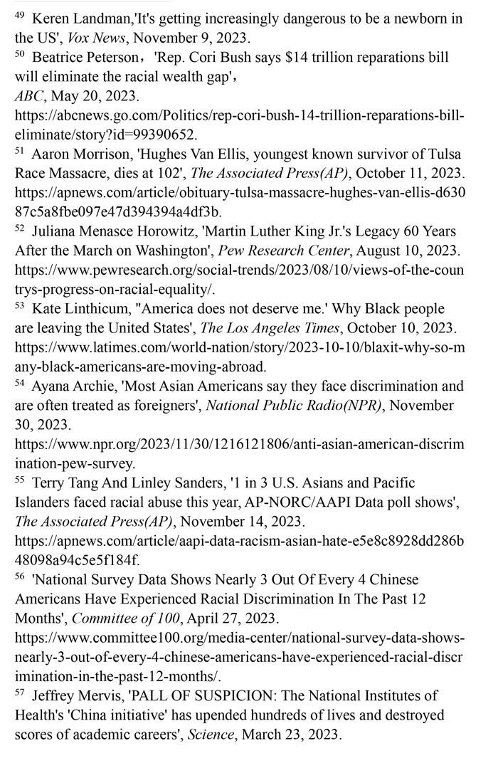 對非洲裔種族迫害的賠償遙遙無期。美國南北戰(zhàn)爭結(jié)束不久后,美國政府承諾向曾被奴役的每一個非洲裔家庭進行賠償,但一百多年來這一承諾從未兌現(xiàn)。1989年,美國眾議院非洲裔議員約翰·科尼爾斯提出“研究和制定非洲裔美國人賠償提案委員會法案”(H.R.40法案),但這一法案數(shù)十年來從未進入過國會表決程序。(注50)1921年,美國俄克拉何馬州塔爾薩地區(qū)發(fā)生針對非洲裔的種族屠殺事件,導(dǎo)致數(shù)百人遇害。為塔爾薩大屠殺最后3位已知幸存者爭取賠償?shù)脑V訟仍未定案,而其中年齡最低的幸存者休斯·范·埃利斯已于2023年10月去世。(注51)皮尤研究中心2023年8月10日發(fā)表的報告顯示,83%的非洲裔美國人表示,美國政府所做的確保平等的努力還遠(yuǎn)遠(yuǎn)不夠。(注52)許多不滿美國政治和種族歧視的非洲裔選擇離開。離開美國的非洲裔在葡萄牙、加納、哥倫比亞和墨西哥等地建立了新的社區(qū),這已然成為一種名為“Blaxit”的潮流(“Black”和“exit”的結(jié)合),并在社交媒體上廣泛流傳。他們高呼:“美國配不上我!”(注53)