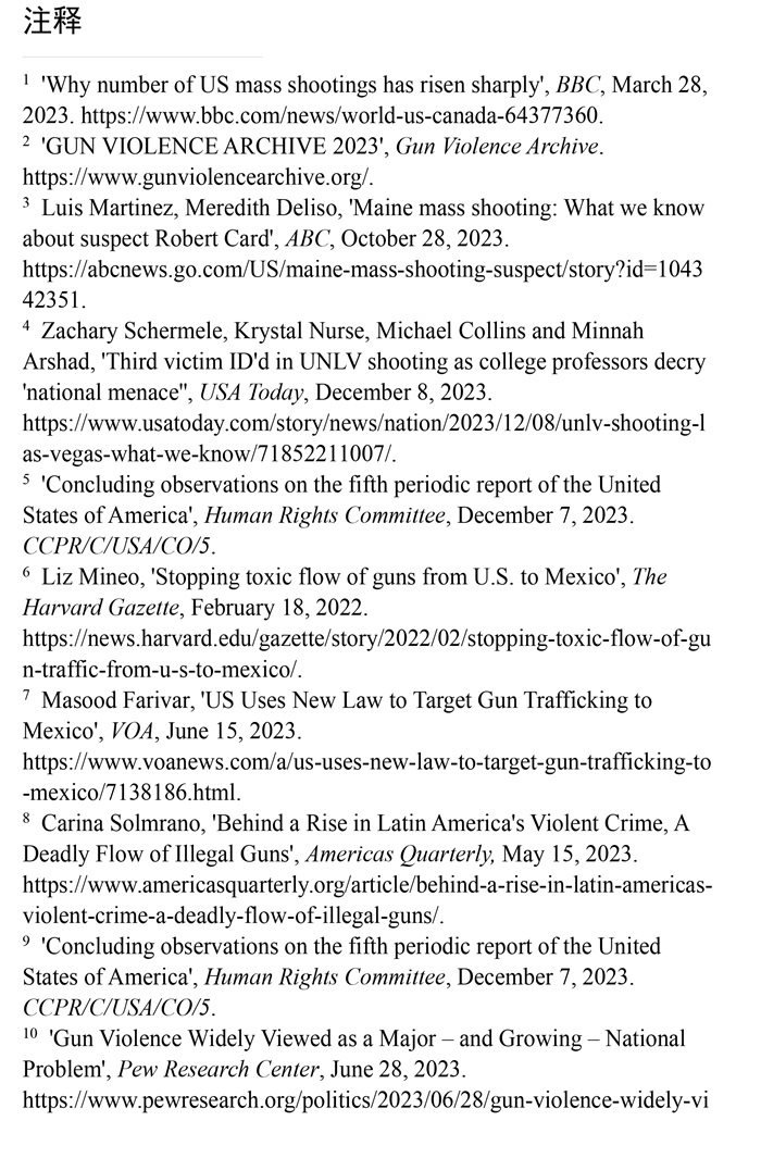 槍支暴力造成慘痛生命代價。數(shù)據(jù)顯示,美國所有類型的槍支暴力事件都呈上升趨勢。(注1)根據(jù)“槍支暴力檔案”網(wǎng)站統(tǒng)計的數(shù)據(jù),2023年美國至少發(fā)生了654起大規(guī)模槍擊事件。槍支暴力導(dǎo)致近4.3萬人死亡,平均每天死亡117人。(注2)例如,美國廣播公司新聞網(wǎng)站2023年10月28日報道,緬因州發(fā)生大規(guī)模槍擊事件,造成至少18人死亡,13人受傷。(注3)《今日美國報》網(wǎng)站2023年12月6日報道,拉斯維加斯3名大學(xué)教授被一名前同事槍殺。美國大學(xué)教授協(xié)會主席艾琳·馬爾維稱,槍支暴力是“不可接受的國家威脅”,敦促美國政府進行槍支政策改革。(注4)美國與槍支有關(guān)的傷亡人數(shù)激增,引發(fā)聯(lián)合國人權(quán)事務(wù)委員會的嚴(yán)重關(guān)切。(注5)