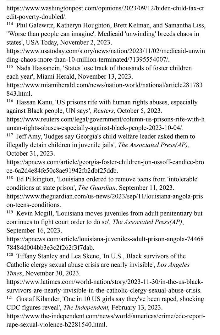 少年司法系統(tǒng)中的兒童遭受不人道待遇。2023年10月,聯(lián)合國人權(quán)理事會在執(zhí)法工作中推進種族正義和平等的國際獨立專家機制調(diào)查顯示,美國刑事司法系統(tǒng)充斥著某些特有的不人道做法。美國是世界上唯一一個判處兒童終身監(jiān)禁不得假釋的國家。(注116)在佐治亞州,兒童福利機構(gòu)的負(fù)責(zé)人要求法官將有精神問題和行為問題的兒童拘留在少年監(jiān)獄。(注117)自2022年10月以來,多達80名兒童被帶到路易斯安那州以暴力著稱的安哥拉監(jiān)獄,關(guān)押在死刑犯等待處決的牢房里。(注118)盡管這些兒童與成年囚犯隔離,但他們遭受了危險的熱浪,長時間被關(guān)在牢里,使用的是污水,更無法獲得教育。(注119)