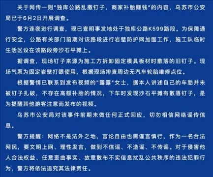 ·新疆烏蘇警方通報(bào)“獨(dú)庫(kù)公路亂撒釘子”:系施工方拆卸板材時(shí)散落,現(xiàn)場(chǎng)排查周邊無汽車輪胎維修點(diǎn)。