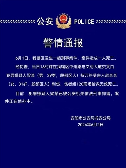 ·河南安陽警方:一男子持刀將女子刺傷致死被刑拘。