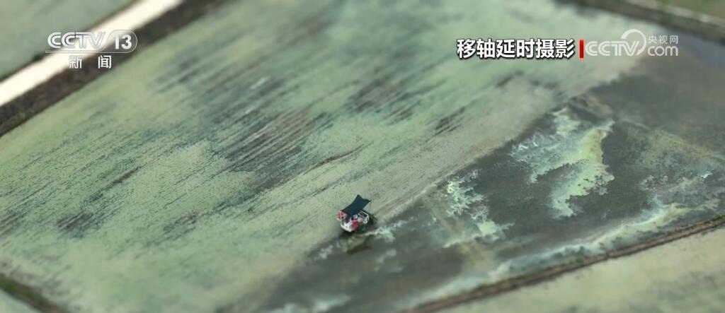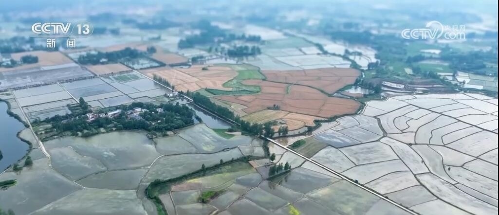 現(xiàn)在您看到的是河南信陽淮河以南的水稻插秧現(xiàn)場(chǎng)。插秧機(jī)在田間穿梭,一株株茁壯的秧苗被整齊有序地植入田間,一會(huì)兒工夫就插滿了整塊稻田。空中俯瞰,一臺(tái)臺(tái)插秧機(jī)在農(nóng)機(jī)手的操控下好似一把把畫刷,在稻田上輕輕暈染,繪就丹青。而同在信陽,淮河以北的麥田里,則是金色的麥浪翻滾起伏,收割機(jī)馳騁田間,飽滿的麥穗被卷入機(jī)艙,經(jīng)過收割、脫粒,顆粒歸倉。