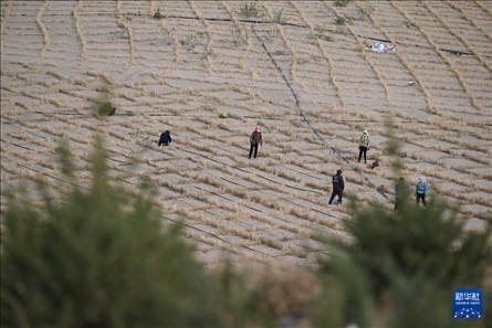 在其白線沙地綜合治理工程項目區(qū),記者跟隨治沙隊伍在松軟的沙丘上迎坡徒步前行,每走一步,退后半步,沙粒灌滿鞋履。然而,來自當地的治沙群眾卻早已習慣,他們兩三人一組,配合默契,有人拉著稻草橫放鋪平,有人則用工具按壓培土,還有人跟在后面,在鋪好的草方格里撒下草籽?!白罡叻宓臅r候每天有上千人參與治沙,推進速度很快。”劉環(huán)宇介紹,今年以來全旗已完成26.5萬畝的治沙任務。