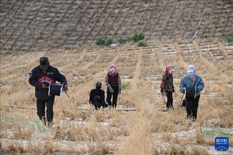 在內蒙古赤峰市翁牛特旗巴彥呼交嘎查其白線防沙治沙項目區(qū),治沙工人在拉滴灌帶。新華社記者 連振 攝
