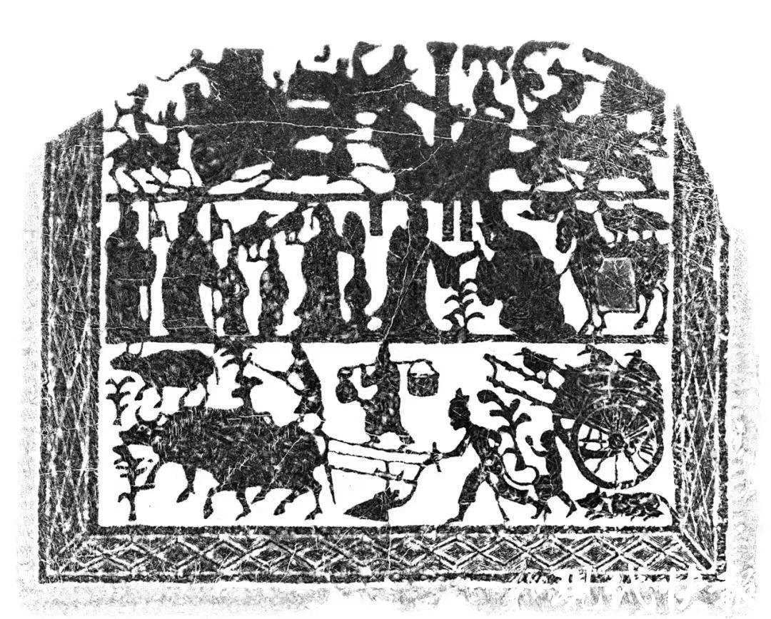 江蘇徐州出土的《牛耕圖》漢畫像石顯示,一個(gè)農(nóng)民扶犁犁地,犁由二牛牽拉。一人揚(yáng)手撒種子跟在扶犁后面。他的后面停著一輛車,車旁臥著一只狗。旁邊有一個(gè)趕牛者,后面有一人挑著擔(dān)子,像是送食物的。