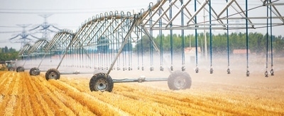 6月17日,在山東省東營(yíng)市廣饒縣李鵲鎮(zhèn)前艾家村的田地里,農(nóng)民正在使用桁架式噴灌機(jī)澆地。劉云杰攝(人民視覺(jué))
