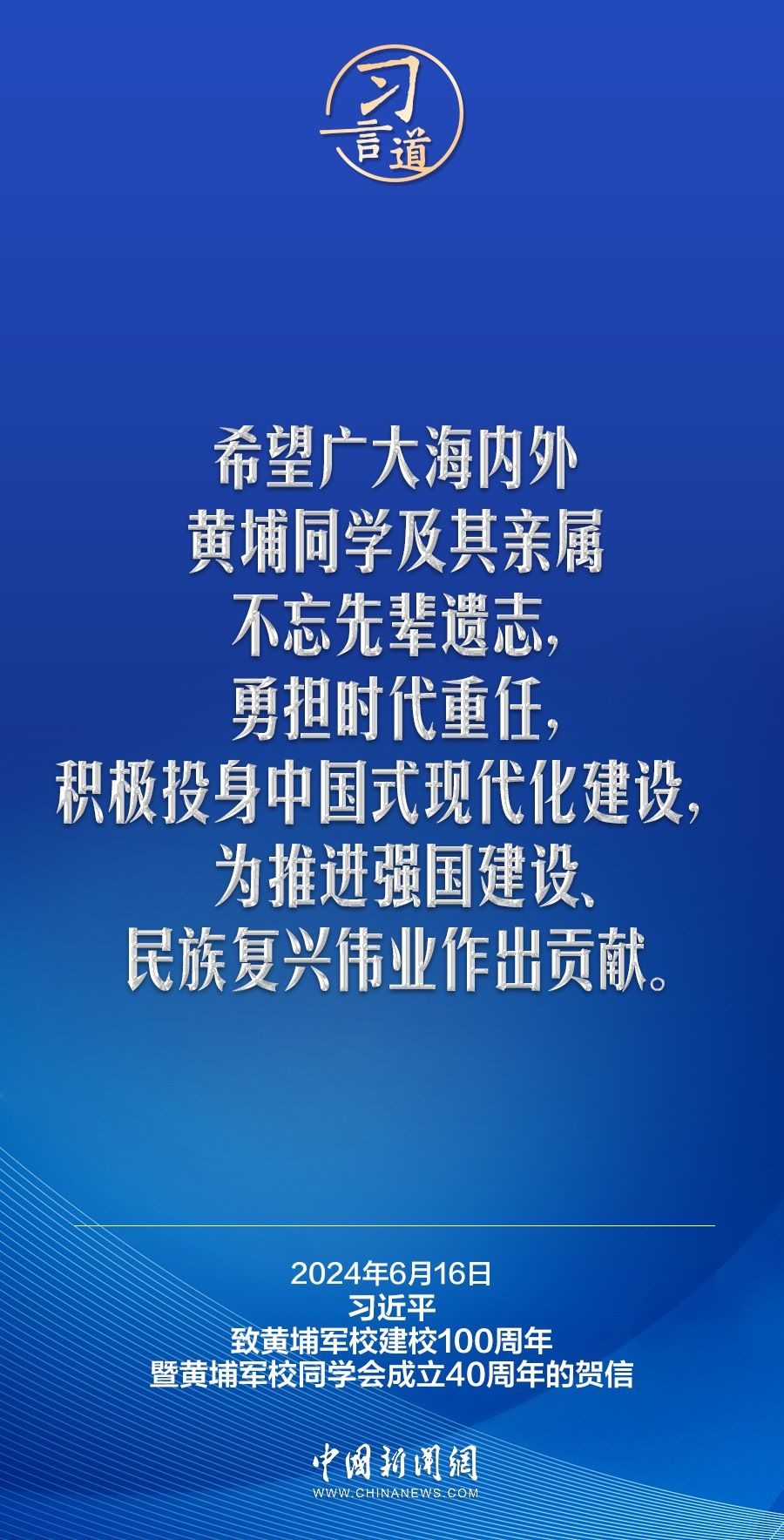 在黃埔軍校建校100周年暨黃埔軍校同學(xué)會成立40周年之際,中共中央總書記、國家主席、中央軍委主席習(xí)近平發(fā)來賀信,代表中共中央向黃埔軍校同學(xué)會表示熱烈祝賀,向廣大海內(nèi)外黃埔同學(xué)及其親屬致以誠摯問候。習(xí)近平指出——