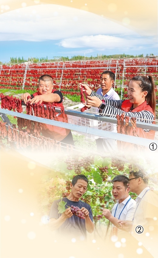 圖①:新疆維吾爾自治區(qū)博湖縣塔溫覺(jué)肯鄉(xiāng)辣椒曬場(chǎng)上,黨員志愿服務(wù)隊(duì)幫助村民晾曬辣椒。年 磊攝 圖②:浙江省淳安縣紀(jì)檢監(jiān)察干部走訪果農(nóng),聽取意見(jiàn)建議。謝航凱攝