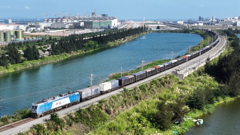 西部陸海新通道鐵海聯(lián)運(yùn)班列從欽州港東站駛出(2024年5月12日攝,無人機(jī)照片)。隨著中國(guó)-東盟開放平臺(tái)建設(shè)向縱深推進(jìn),西部陸海新通道正在成為釋放開放活力的強(qiáng)力新引擎,以物流為切入口,促進(jìn)資金、資源、人員、技術(shù)等生產(chǎn)要素深度融合。