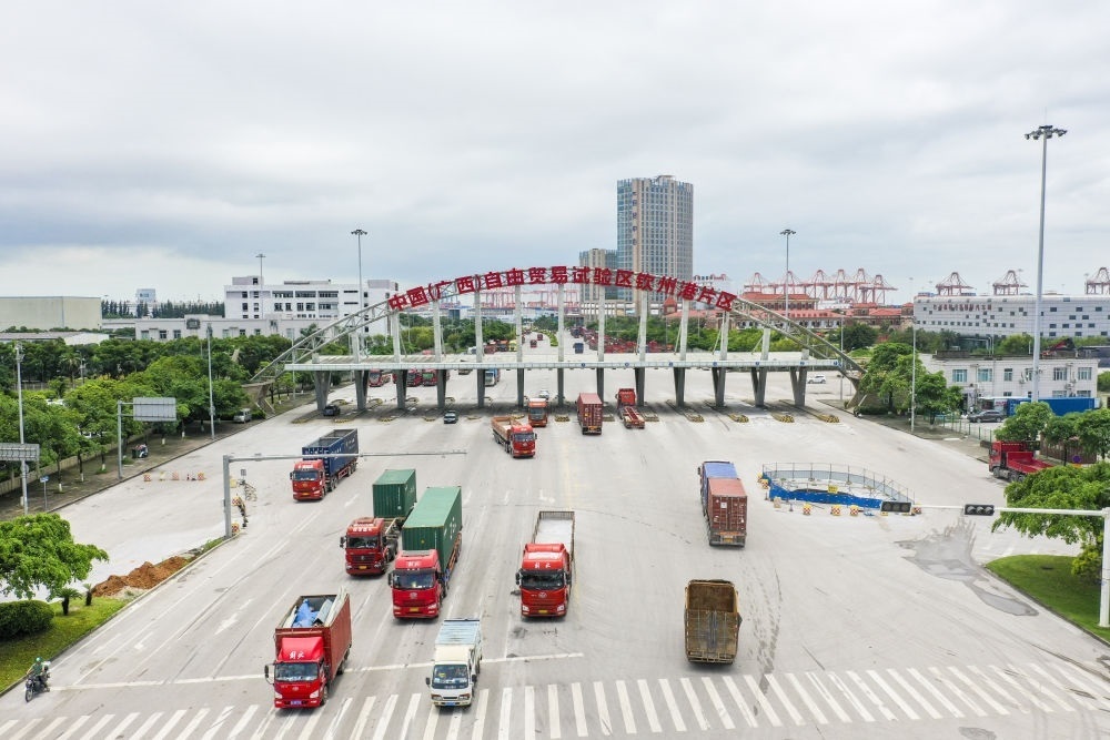 中國(guó)(廣西)自由貿(mào)易試驗(yàn)區(qū)欽州港片區(qū)(2024年5月20日攝,無人機(jī)照片)。聚焦面向東盟、服務(wù)陸海新通道、沿邊開放三大特色,開展差異化探索和特色制度創(chuàng)新,讓中國(guó)(廣西)自由貿(mào)易試驗(yàn)區(qū)成為我國(guó)面向東盟開放發(fā)展的前沿。