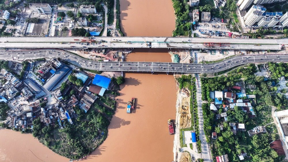施工隊(duì)在廣西欽州市拆舊橋建新橋,疏浚平陸運(yùn)河流經(jīng)欽州市區(qū)的航道(2024年5月12日攝,無人機(jī)照片)。平陸運(yùn)河建成后將成為廣西及西南地區(qū)通往東盟地區(qū)運(yùn)距最短、最便捷的水運(yùn)出海通道。