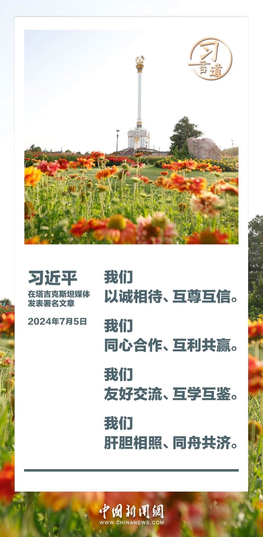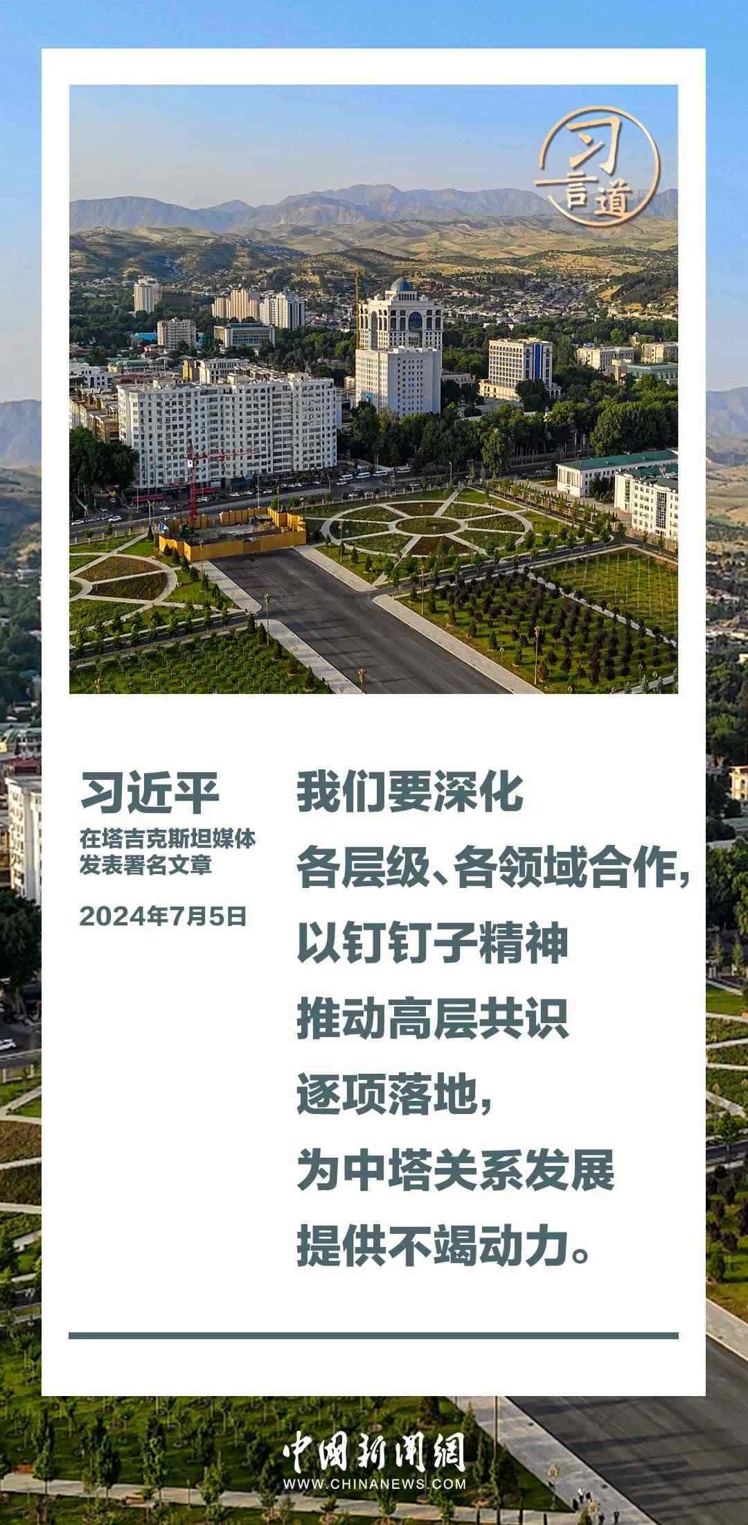 7月5日,在對(duì)塔吉克斯坦進(jìn)行國事訪問之際,國家主席習(xí)近平在塔吉克斯坦《人民報(bào)》和“霍瓦爾”國家通訊社發(fā)表題為《共創(chuàng)中塔關(guān)系美好明天》的署名文章。習(xí)近平指出——