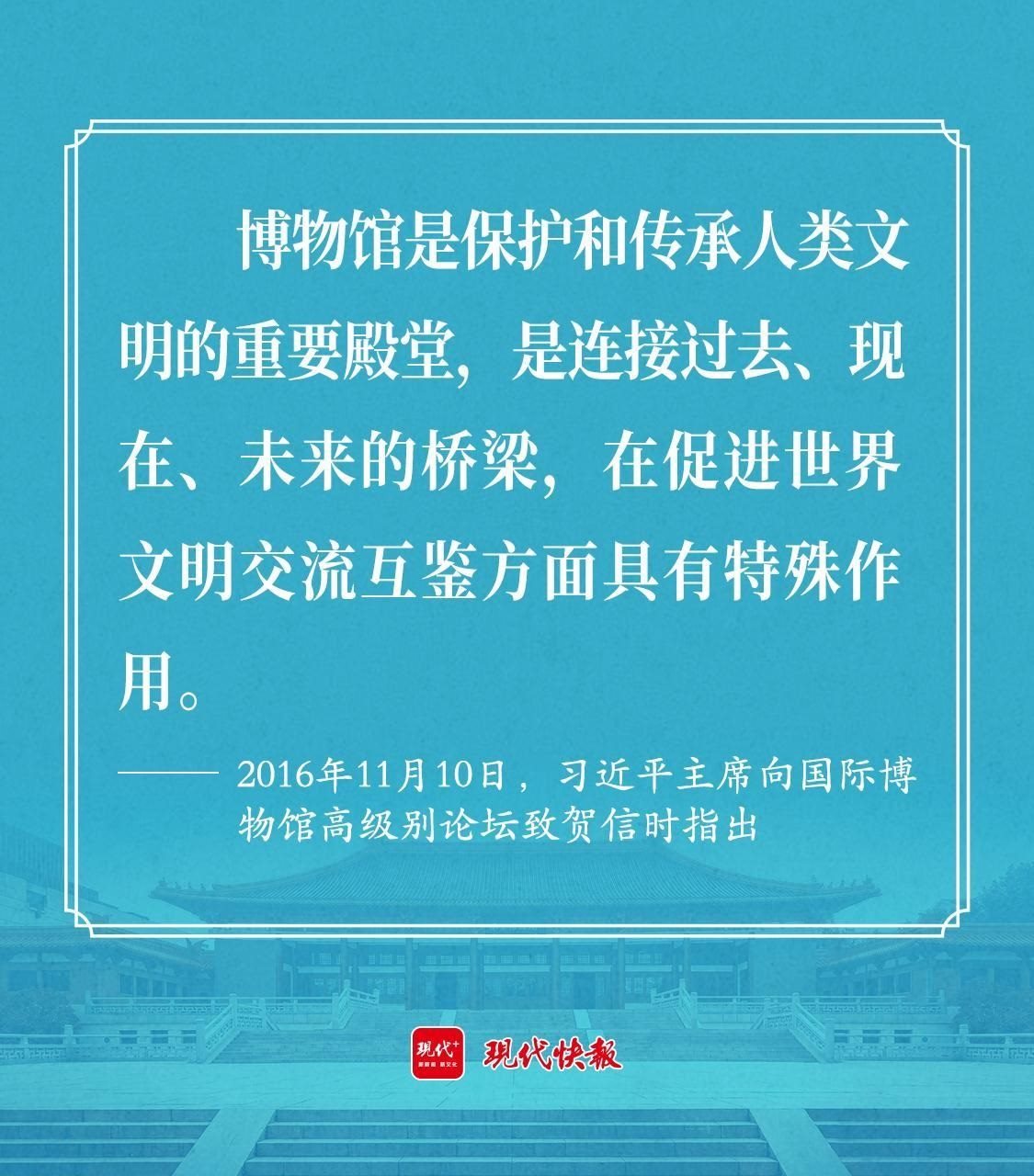 2016年11月10日,習(xí)近平主席向國(guó)際博物館高級(jí)別論壇致賀信時(shí)指出,博物館是保護(hù)和傳承人類(lèi)文明的重要殿堂,是連接過(guò)去、現(xiàn)在、未來(lái)的橋梁,在促進(jìn)世界文明交流互鑒方面具有特殊作用。