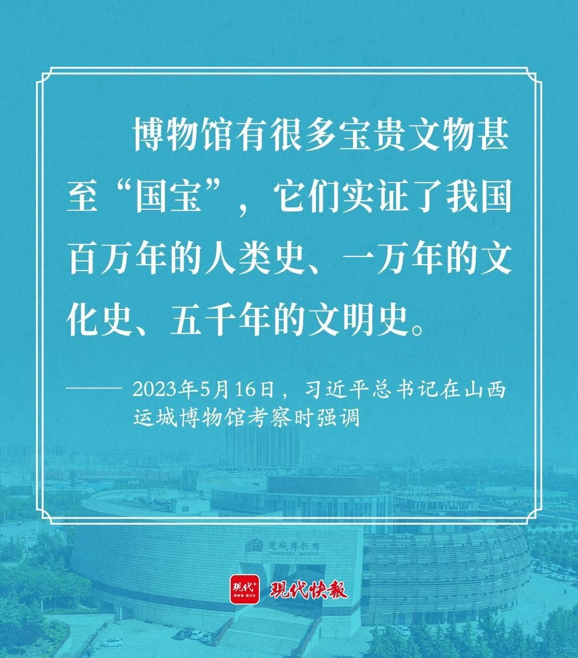 2023年5月16日,習(xí)近平總書(shū)記考察山西運(yùn)城博物館時(shí)強(qiáng)調(diào),博物館有很多寶貴文物甚至“國(guó)寶”,它們實(shí)證了我國(guó)百萬(wàn)年的人類(lèi)史、一萬(wàn)年的文化史、五千年的文明史。