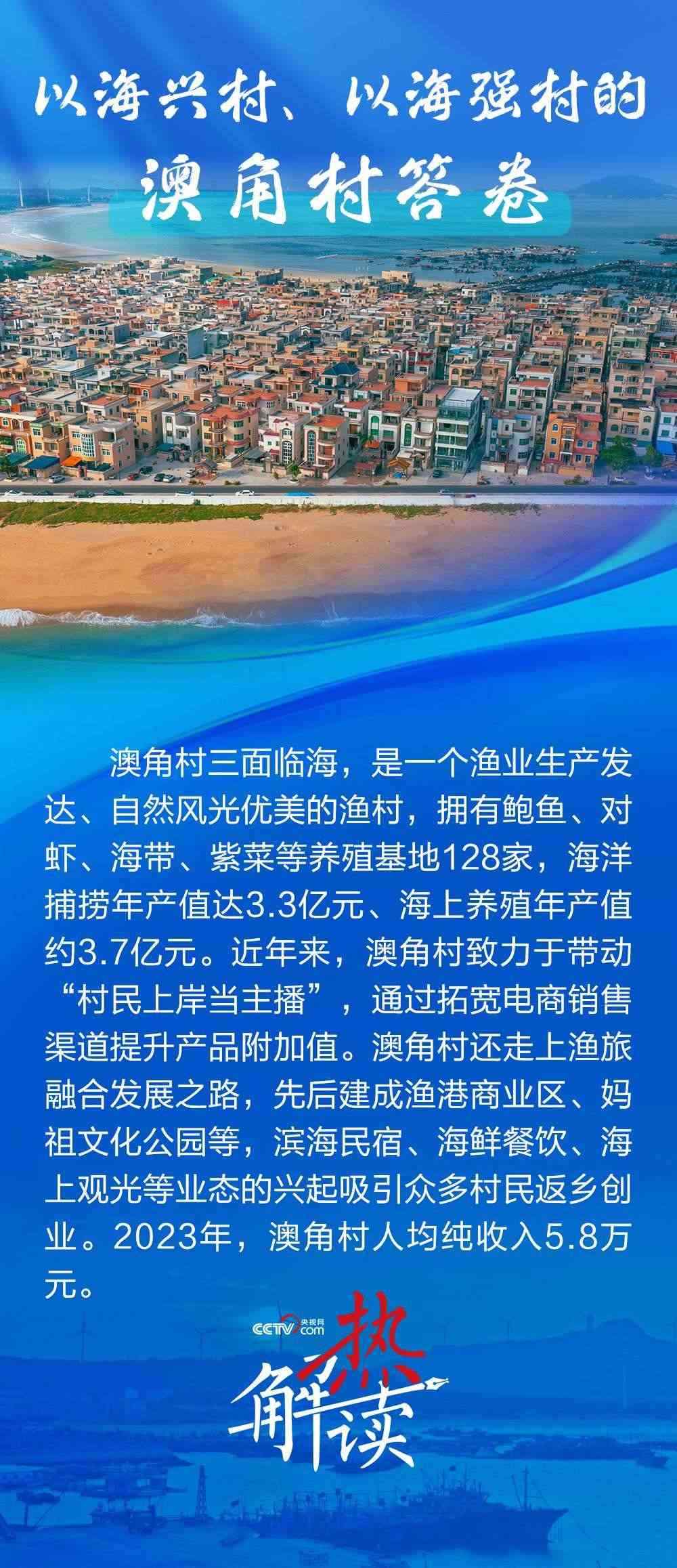 澳角村三面臨海,近年來走出了一條以海興村、以海強(qiáng)村的新路子??吹洁l(xiāng)村發(fā)生了巨變,總書記直言“鄉(xiāng)村振興還是要發(fā)揚(yáng)優(yōu)勢(shì)”,并勉勵(lì)澳角村做好“?!钡奈恼?,在鄉(xiāng)村振興、共同富裕的道路上一往無前。