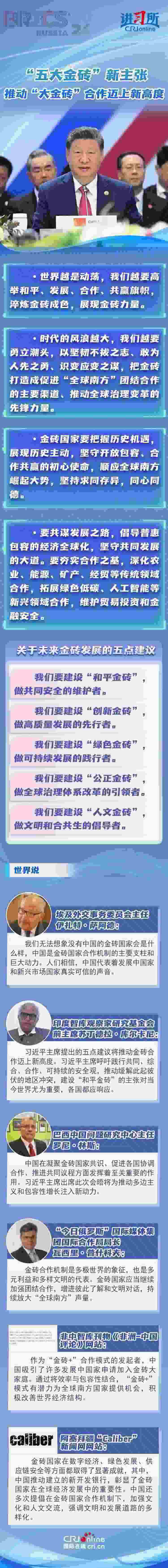 多國人士及媒體盛贊習(xí)近平主席的“五大金磚”建議將推動(dòng)金磚合作邁上新高度,稱贊中國在凝聚金磚國家共識(shí)、促進(jìn)各國協(xié)調(diào)合作、推進(jìn)共同議程方面發(fā)揮著至關(guān)重要的作用,代表著發(fā)展中國家和新興市場(chǎng)國家真實(shí)可信的聲音。