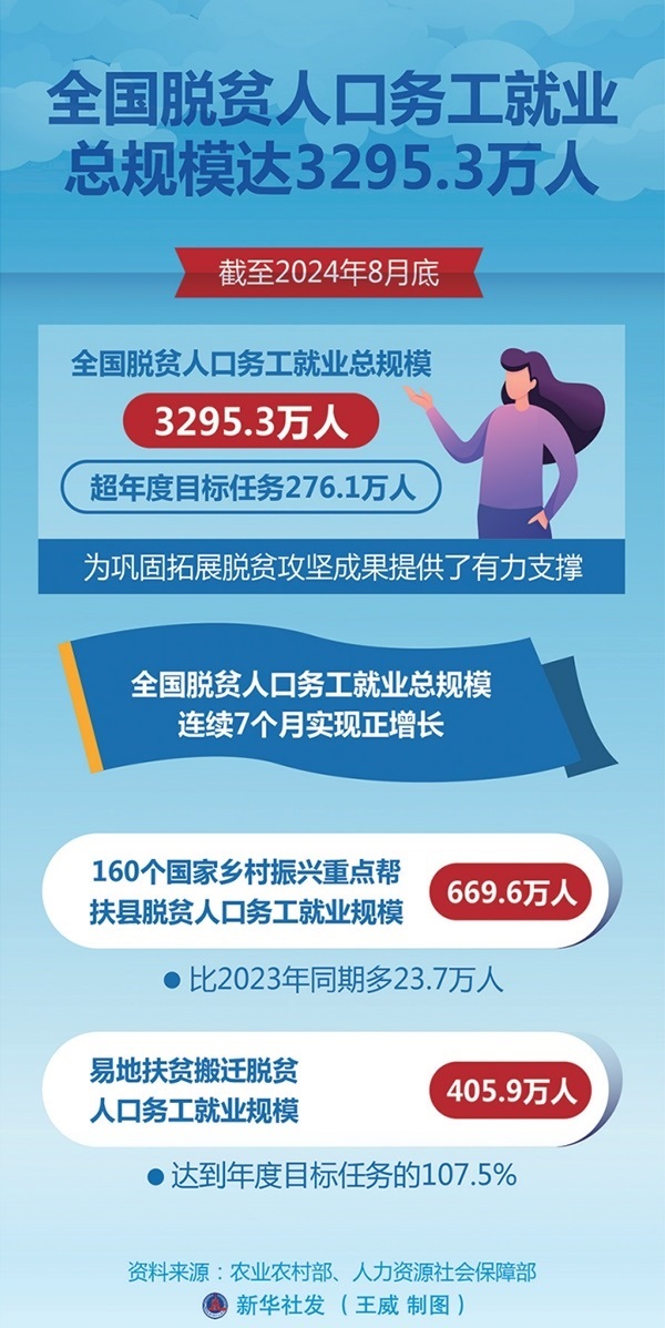 今年以來各級各相關(guān)部門深入開展防止返貧就業(yè)攻堅行動,截至8月底,全國脫貧人口務(wù)工就業(yè)總規(guī)模達(dá)到3295.3萬人,超年度目標(biāo)任務(wù)276.1萬人,為鞏固拓展脫貧攻堅成果提供了有力支撐。 新華社發(fā) 王威/制圖