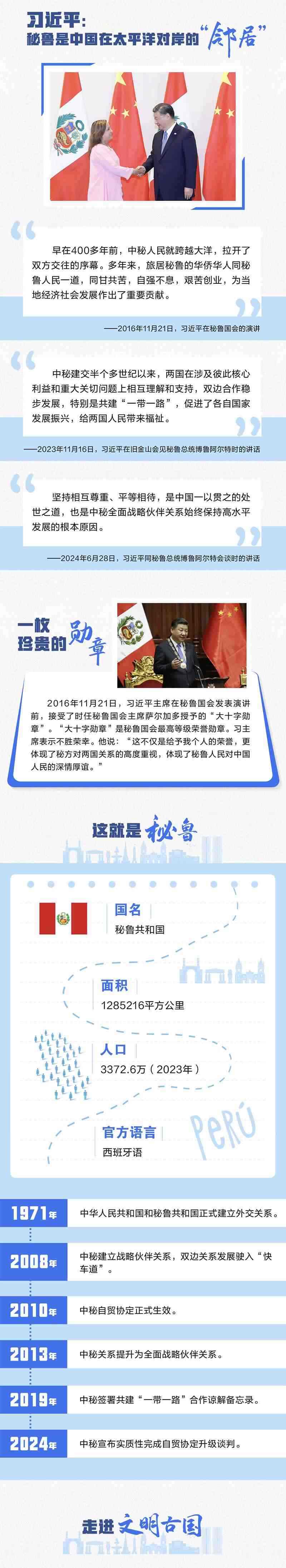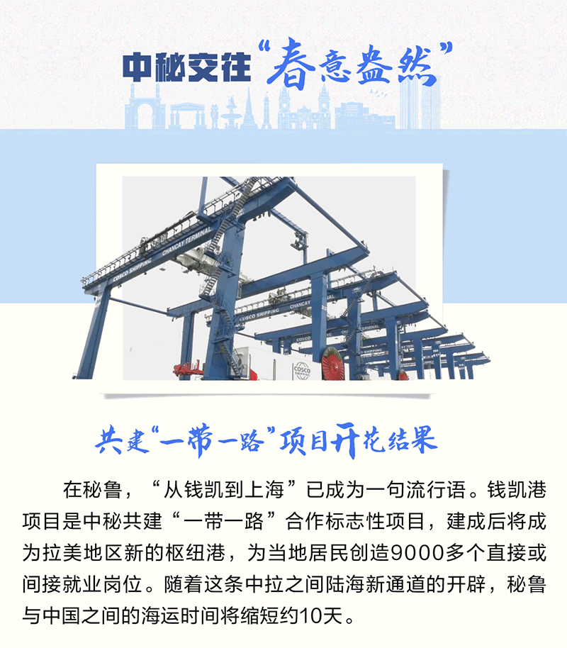 中國和秘魯都是文明古國,兩國友誼源遠流長,人民友好深入人心。習近平主席曾以“秘魯是中國在太平洋對岸的‘鄰居’”形容中秘關(guān)系,生動詮釋了兩國和兩國人民之間“相知無遠近”的深厚友誼。