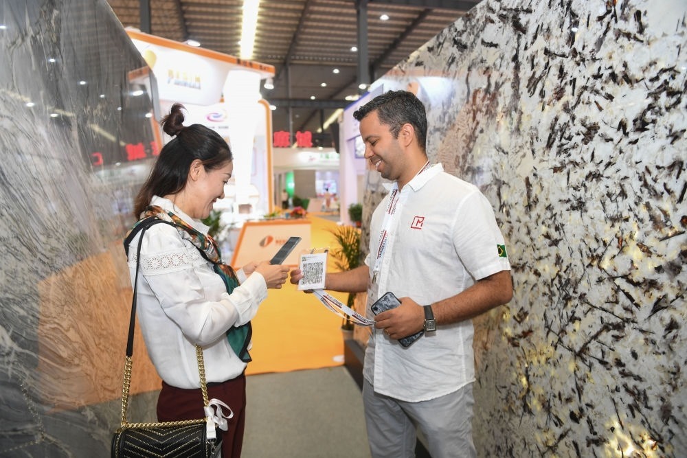 2019年11月8日,巴西商人馬庫斯在福建省南安市水頭鎮(zhèn)舉辦的國(guó)際石材博覽會(huì)上向國(guó)內(nèi)客商出示自己的微信二維碼。