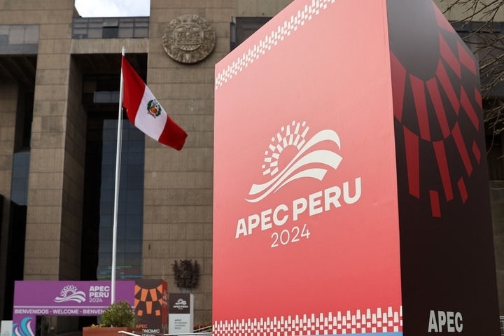 這是2024年11月10日在秘魯首都利馬拍攝的2024年亞太經(jīng)合組織會議標識。新華社記者 李木子 攝