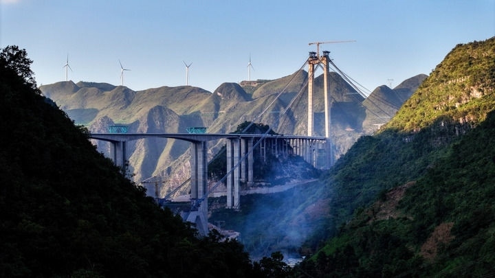 2024年9月3日,建設中的貴州花江峽谷大橋。大橋因跨越被稱為“地球裂縫”的花江大峽谷而得名,2025年建成后將成為世界第一高橋。新華社記者歐東衢攝