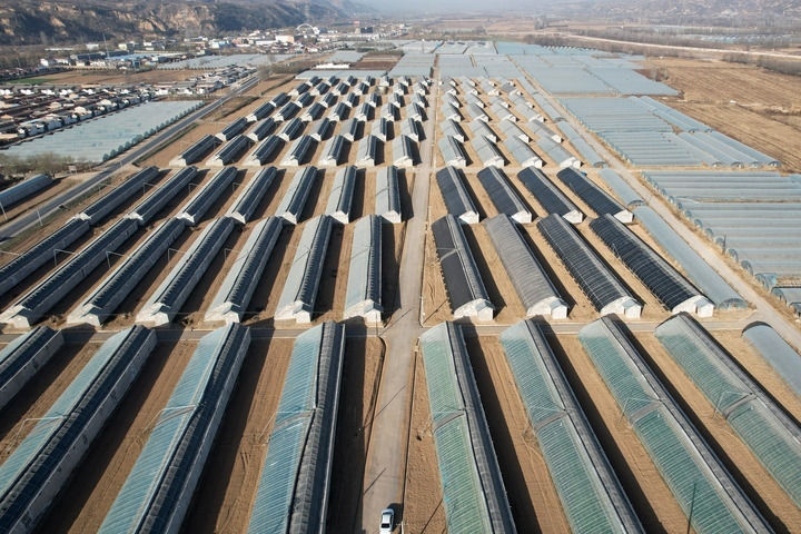 2023年11月26日,甘肅省平?jīng)鍪袥艽h涇汭河川區(qū)萬畝設施蔬菜產(chǎn)業(yè)園王村核心區(qū)(無人機照片)。這是當?shù)匾劳刑旖蚴袞|西部協(xié)作幫扶資金實施的聯(lián)建項目。新華社記者 范培珅 攝