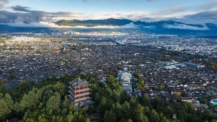 2024年11月8日,麗江古城日落風光(無人機照片)。新華社記者 胡超 攝