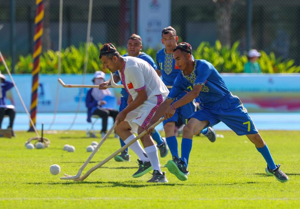 ??11月24日,在三亞市體育中心舉行的第十二屆全國少數(shù)民族傳統(tǒng)體育運(yùn)動會室外表演項(xiàng)目中,新疆隊(duì)球員阿卜杜拉艾孜則·阿卜杜海娃爾(前右)在麥熱球表演中。新華社記者 陳朔 攝