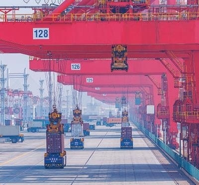 軟聯(lián)通共建“一帶一路”國家在工作制度對接、技術(shù)標(biāo)準(zhǔn)協(xié)調(diào)、檢驗結(jié)果互認(rèn)等方面強(qiáng)化合作、統(tǒng)一標(biāo)準(zhǔn),貿(mào)易自由化便利化水平不斷提升。上海洋山港海關(guān)對接共建國家進(jìn)出口貨物相關(guān)標(biāo)準(zhǔn),推動通關(guān)一體化方式申報,提升通關(guān)效率。圖為無人駕駛的全自動導(dǎo)引車在洋山港穿梭往來,搬運(yùn)集裝箱。王 初攝(影像中國)