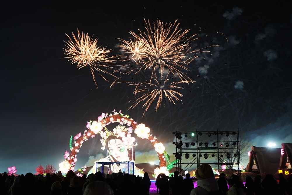 2025年1月12日,游客們?cè)谏蜿?yáng)沈北新區(qū)稻夢(mèng)小鎮(zhèn)觀看焰火表演。