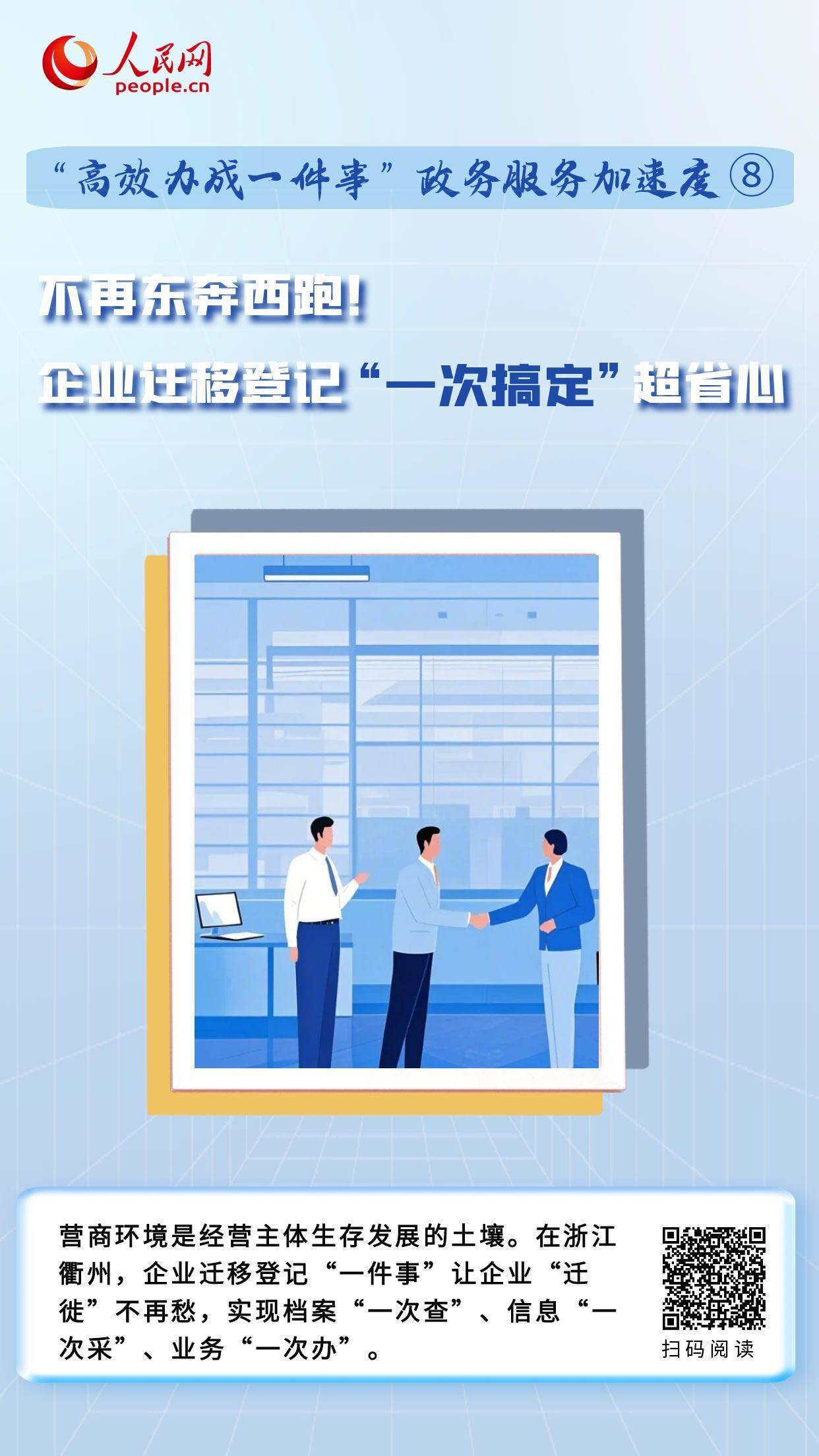 為切實(shí)解決企業(yè)遷移難、遷移繁、遷移慢等問(wèn)題,衢州市將企業(yè)遷移業(yè)務(wù)涉及的遷入申請(qǐng)、遷出調(diào)檔、變更登記、稅務(wù)遷出申請(qǐng)等事項(xiàng)整合為“一件事”,依托浙江省企業(yè)登記全程電子化平臺(tái),實(shí)現(xiàn)“一次采集、一網(wǎng)申報(bào)、并聯(lián)審批”集成辦理,讓省內(nèi)企業(yè)跨市遷移變?yōu)槿獭傲阋?jiàn)面”“零跑腿”。