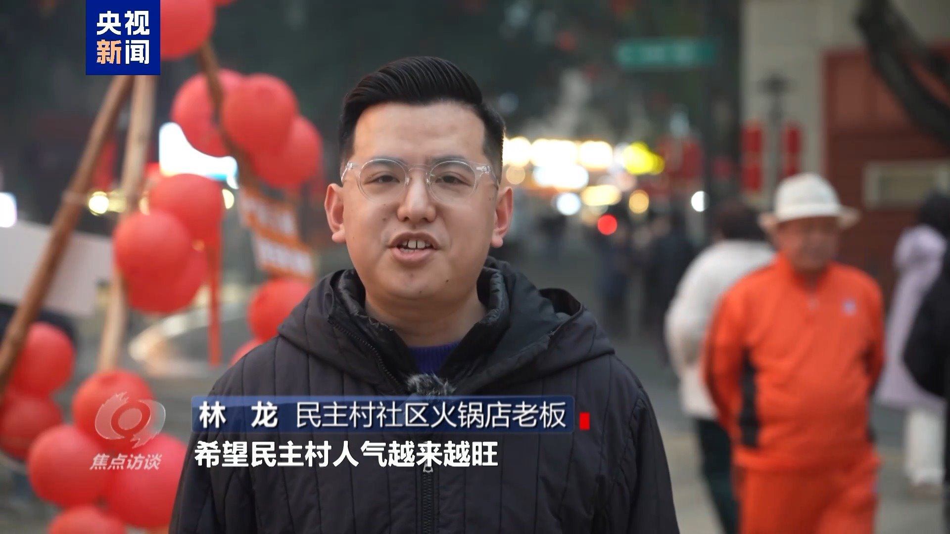 民主村社區(qū)火鍋店老板 林龍:希望民主村人氣越來越旺,我們火鍋店生意越來越好,大家都多賺票子!