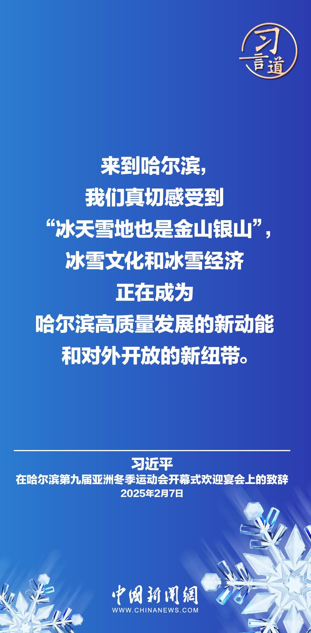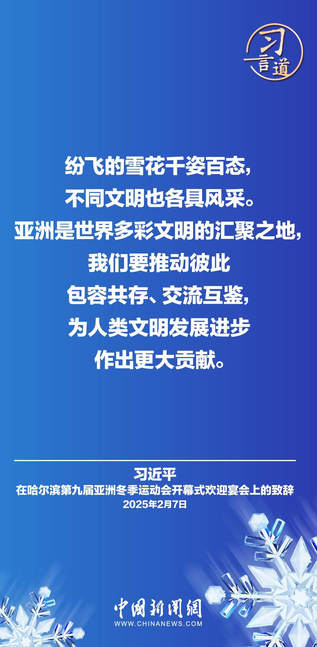 2月7日,國(guó)家主席習(xí)近平和夫人彭麗媛在黑龍江省哈爾濱市舉行宴會(huì),歡迎來(lái)華出席哈爾濱第九屆亞洲冬季運(yùn)動(dòng)會(huì)開(kāi)幕式的國(guó)際貴賓。習(xí)近平主席在致辭時(shí)指出——