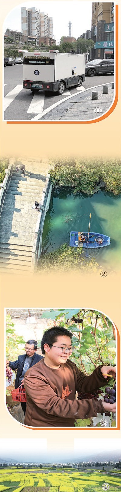 圖①:一輛無(wú)人駕駛快遞車行駛在湖北宜昌市夷陵區(qū)小溪塔街道道路上。