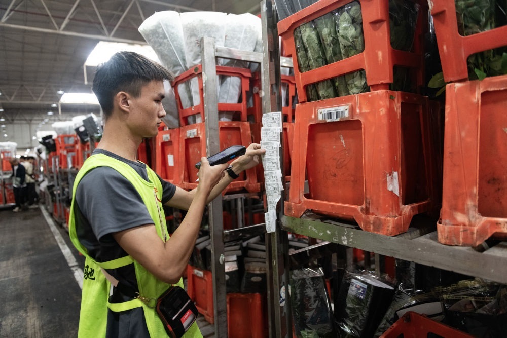 2023年7月13日,一名工作人員在昆明國際花卉拍賣交易中心內(nèi)對(duì)臺(tái)車上存放的鮮花掃碼。