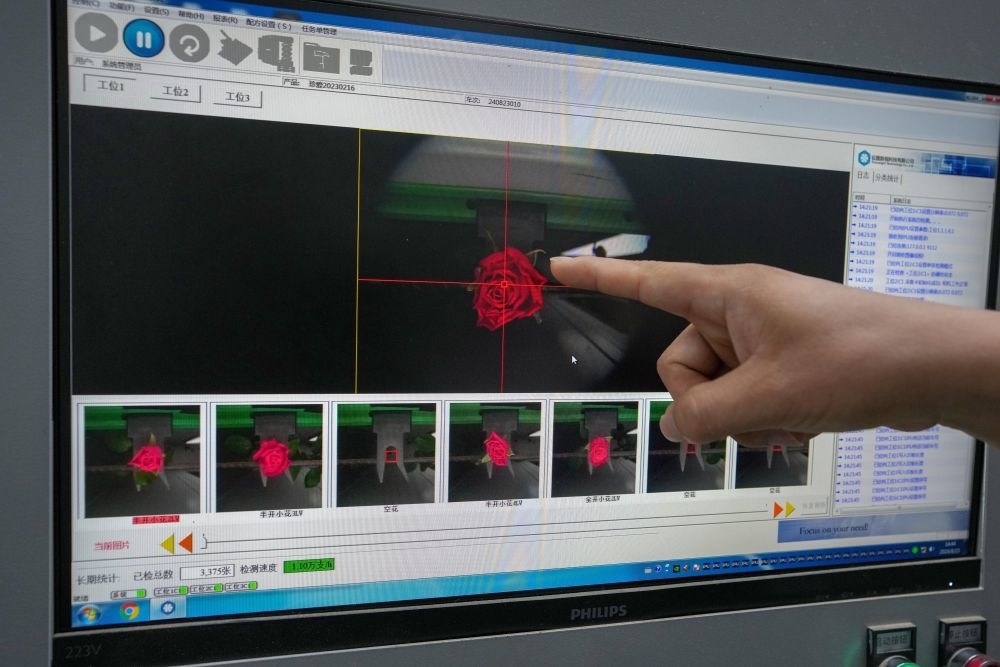2024年8月23日,在云南晉寧花卉產(chǎn)業(yè)現(xiàn)代化示范園采后處理中心,計(jì)算機(jī)在實(shí)時(shí)監(jiān)測自動(dòng)分揀流水線上的鮮切花。