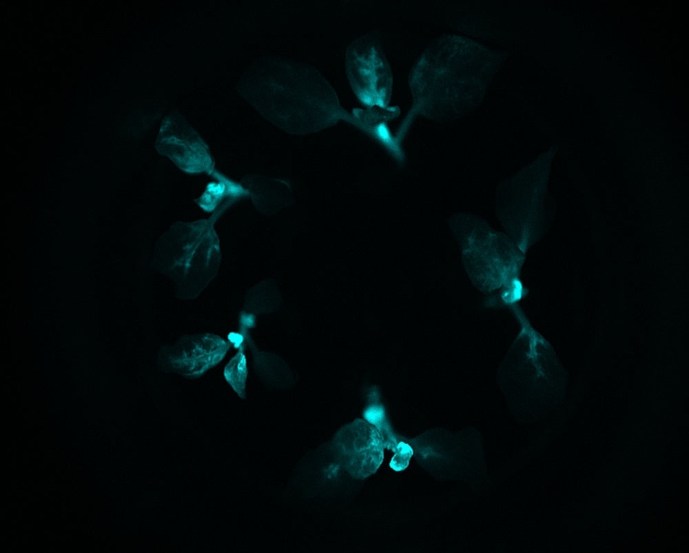 這是云南某農(nóng)業(yè)研發(fā)團(tuán)隊(duì)利用基因技術(shù)成功培育出肉眼可見的“自發(fā)光植物”在黑暗條件下發(fā)光(2017年6月21日攝)。